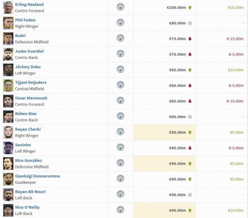 曼城球员身价变动:哈兰德上涨至2亿欧,罗德里下跌1500万欧